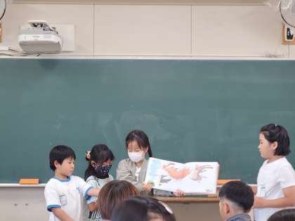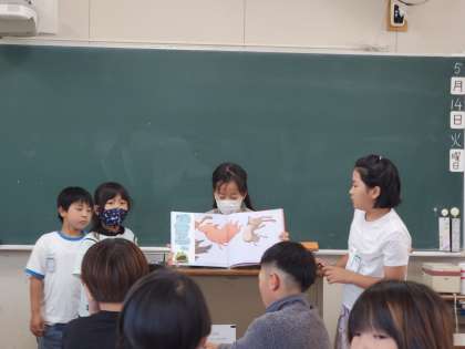 休み時間に図書係の子たちが読み聞かせをしてくれました。3年生の子どもたちも見に来ていました。