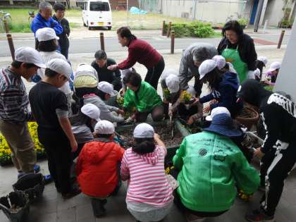 八幡屋公園事務所・八幡屋はぐくみネット・PTA等地域の方々のご協力で、秋のビオラの植栽を行いました。