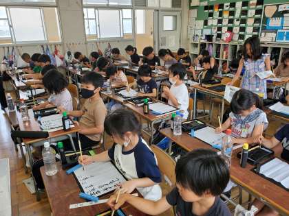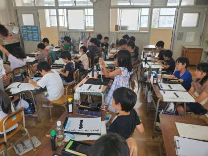 はじめて小筆を使って名前を発表しました。「一」という字を書きました。