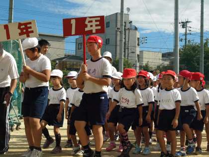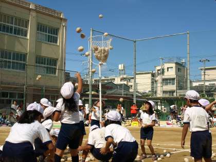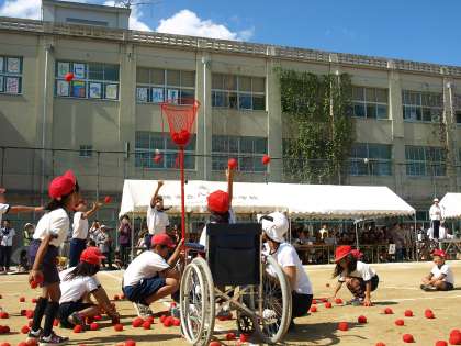 赤勝て。白勝て。どちらの籠にたくさん球が入ったでしょうか。勝負の後は、元のように片付けます。
