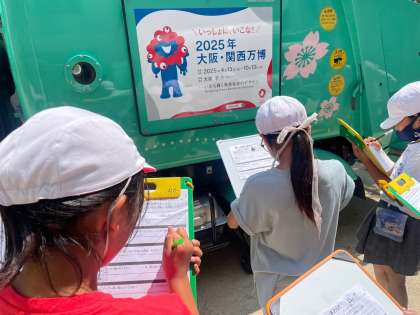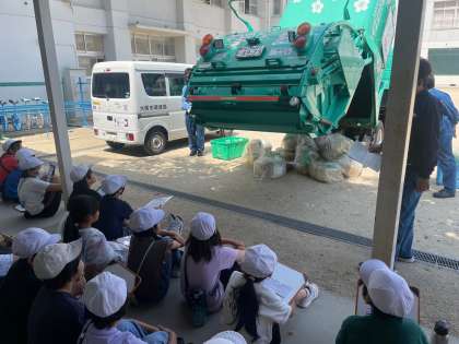 学校に大阪市環境局の方が来て、ゴミの授業をしてくれました。また、パッカー車を近くで見ることができました。