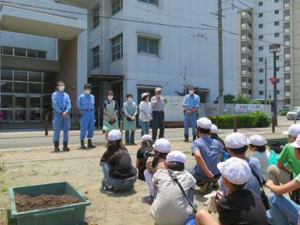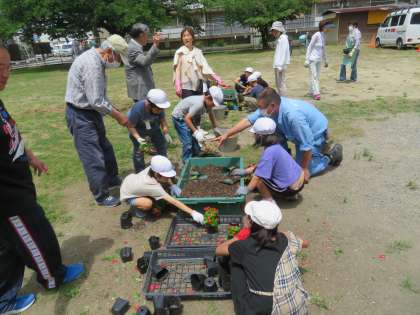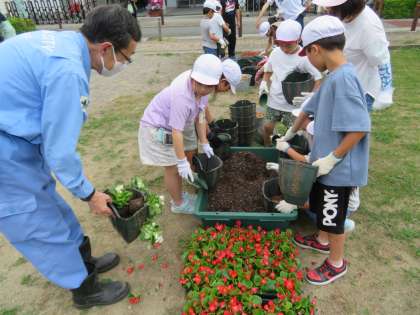 地域、はぐくみネット、八幡屋公園事務所のみなさんにご協力いただきながら、春の植栽活動を行いました。ベゴニアの花をフラワーハンギングにして、あいさつ通りに飾ります。