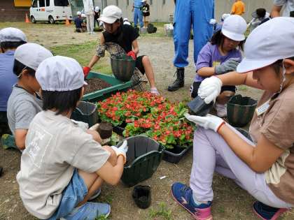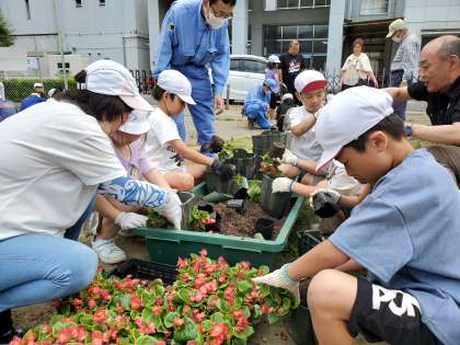 植栽活動でベゴニアを植えました。植えたベゴニアは、あいさつ通りに飾ってありますので、通りかかる際にぜひご覧になってください。