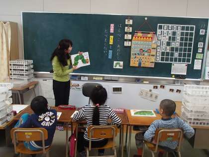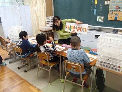 「はらぺこあおむし」のお話を楽しもう の単元の勉強をしました。「はらぺこあおむし」の歌を聴きながら、絵本を見たり、「いつ」「何を」「いくつ」食べたか考えたりしました。ふだんは別々の時間で勉強している3人が協力しながら学習しました。途中で本物のあおむしも登場しました。