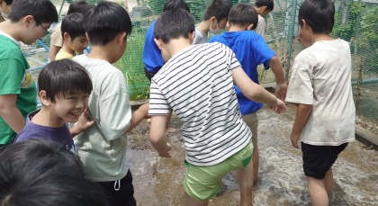 水を入れたので代かきをしました。どろどろの感触が初めてで、歩きたくても足をとられてしまってうまく前に進めませんでした。そのあと、住吉大社さんから分けていただいた苗を植えました。