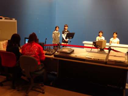 放送体験活動。前もって作っていた原稿をもとに、アナウンサー・レポーター・カメラ及び音響機器操作係の3つに分かれて、ニュース番組を作成しました。みんな緊張しながらも真剣に取り組んでいました。