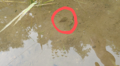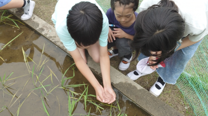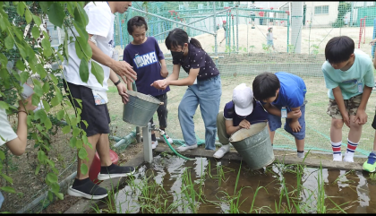 田んぼの様子を観察しに行ったら、水の中で何か動くものを発見。メダカらしき生物が2種類と…これはまさかカブトガニの赤ちゃん?! と思ったらカブトエビでした。となりの池と地下でつながっているので入り込んだようです。みんな大興奮で捕まえていました。教室で育てるそうです。