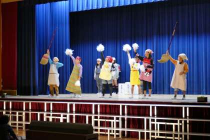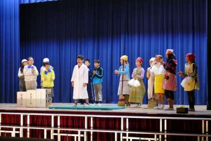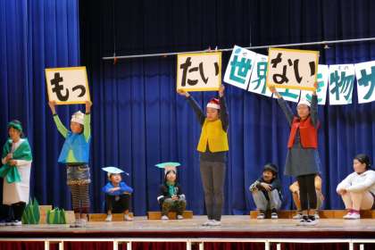 環境問題について楽しく演じてくれました。「もったいないおばちゃん」が大人気でした。