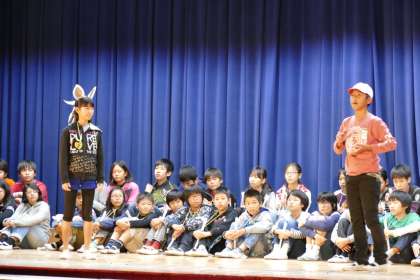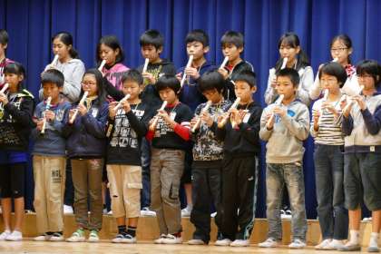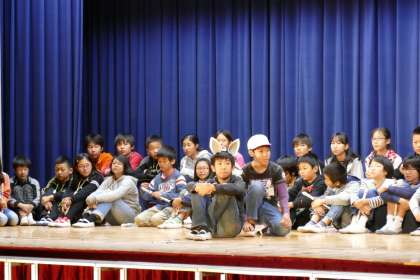 学校には来ず、発明品を作るために捨てられたものを拾い集めている「けんたくん」が、捨てられた木馬と出会い、学校の友達と遊ぼうとするようになるまでをリコーダーの演奏をバックに演じました。台本通りに話し、演じるのではなく、何を表せばよいのか、どのように表せばよいのか、子供たちは、自分たちで悩みながら考え、演じました。