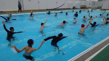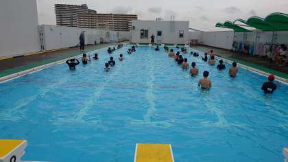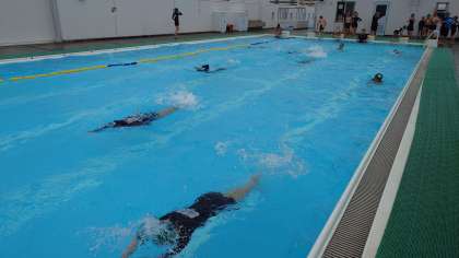空は雨模様でしたが、気温が高かったので泳ぐことができました。息つぎが難しくて、途中で立ってしまいます。
