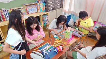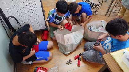 林間学習の準備をしています。「懐中電灯がつかない…」と頭をひねる子どもたち。電池の向きが違うのだと思うけど、もう少し自分たちで考えさせます。