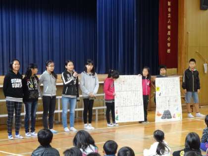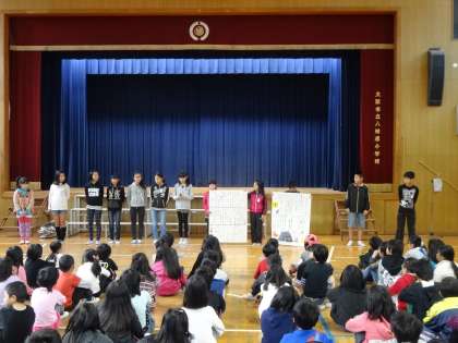 今日は代表委員によるベルマーク集会をしました。最初にベルマークと交換でいただいた「CDラジオ」が代表委員から学級の代表に渡されました。授業や行事で大事に活用させていただきます。なお、集めたベルマークは1点1円として、10%分は、へき地や発展途上国、被災地などの学校に寄付として贈られます。