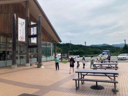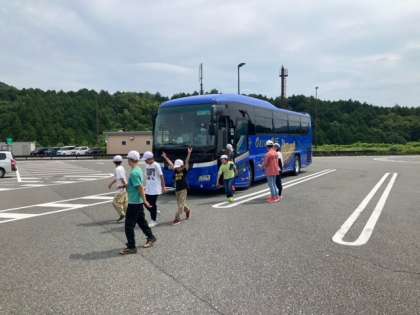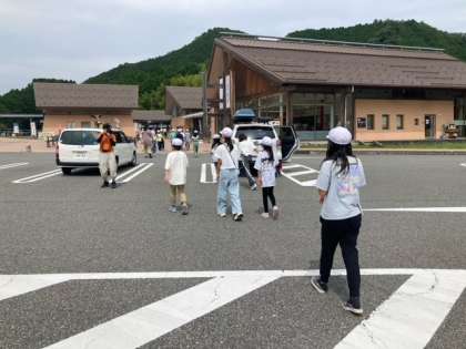バスの中では、なぞなぞやダジャレ大会で子どもたちは楽しく過ごしています。予定通り但馬まほろばの里に着きました。