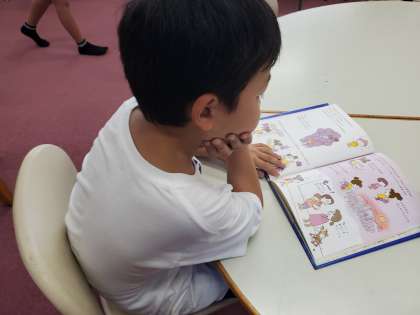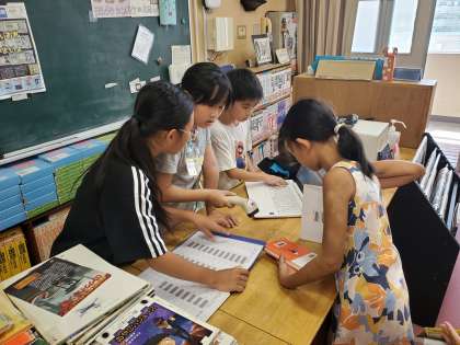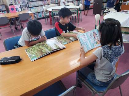 図書室で本を読みました。図書係の子たちがバーコードリーダーを読み取るお仕事をしました。