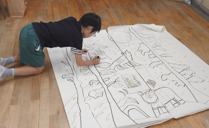 創立百周年記念の一環で階段アートを作っています。すてきな作品ができあがりそうです。