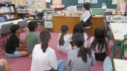 図書の時間での様子です。図書館司書の先生に読み聞かせをしていただきました。