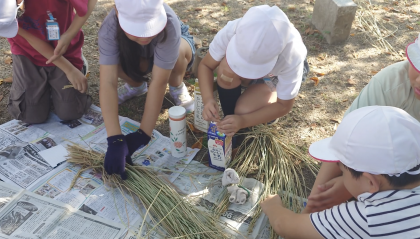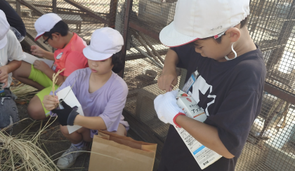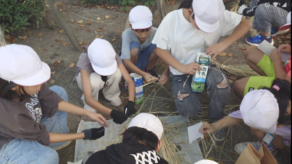 干していたお米の脱穀をしました。ひと株ずつ手作業で脱穀したので大変でしたが、木陰で友だちとおしゃべりしながらやったのであっという間でした。牛乳パックの中に入れて蓋を押さえて藁だけ抜き取ったり、手でしごき取ったりして、全部で3.6kgとれました。精米したら何kgになるかな?