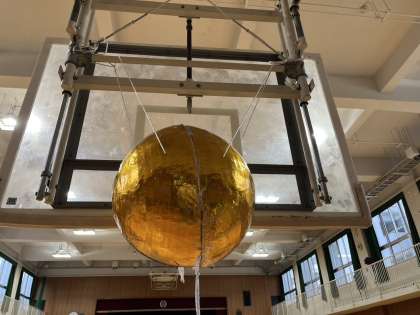 創立100周年お祝いの会に向けて、くす玉を設置しました。うまく割れるかな?