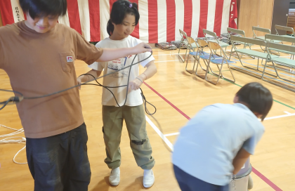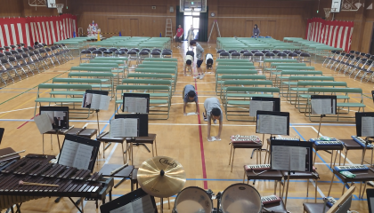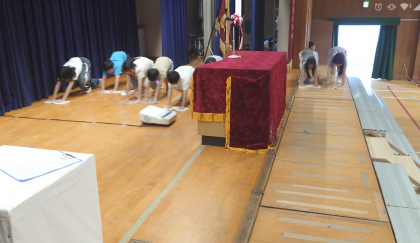 明日の式典に向けて、会場を設営しました。練習のとおり、喜びの言葉や楽器演奏がうまくいきますようにとみんなで願いながら掃除しました。