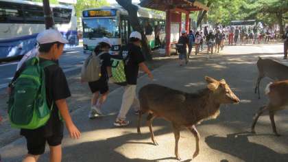 5年生が奈良公園・東大寺へ行きました。奈良公園に着き、鹿と出会った時、みんな「かわいい!」「思ってたより大きい!」と大興奮でした。