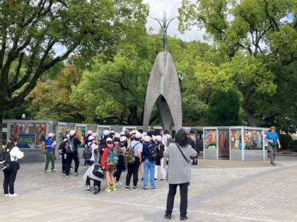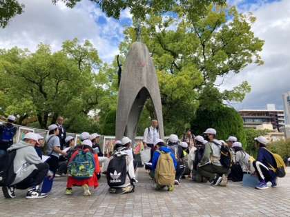 原爆の子の像に平和への誓いを伝え、全校児童で折った折り鶴を奉納しました。