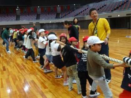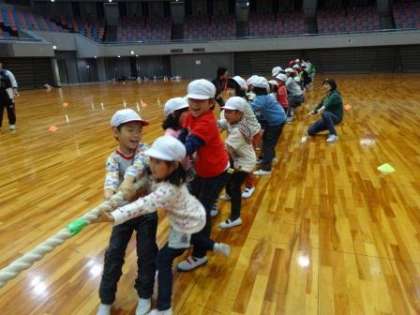 2種目目は、綱引き。みんなで力を合わせて一番盛り上がりました。先生も声がかれました。オレンジチームもよくがんばりましたが、トップは黄色チームでした。