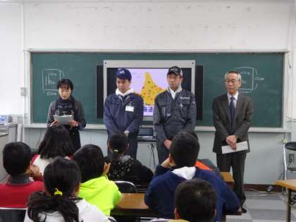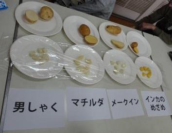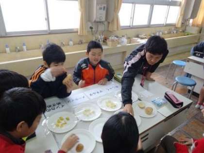 北海道のホクレン・JAめむろの職員の方、芽室(めむろ)町の生産組合長さん、大阪の中央青果の方のご協力で、じゃがいもについての出前授業をしていただきました。3時間目は、「じゃがいもについて学ぼう」で、じゃがいもについて知らなかったことをいろいろと教えていただきました。4時間目は、「じゃがいもを食べ比べてみよう」で、4種類のじゃがいもを食べ比べたり、生産者の方にじゃがいもづくりについてお話ししていただきました。