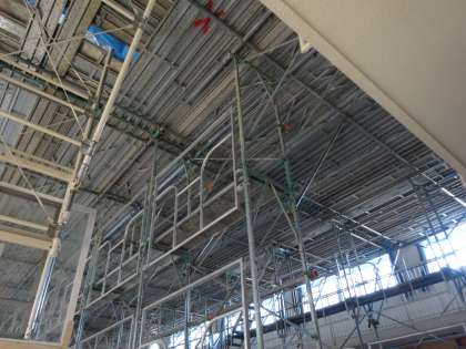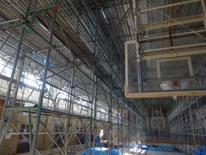 講堂の中には、足場が組まれ、中天井のボードの撤去と電気設備工事が行われています。工事期間は、1月末までの予定です。