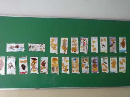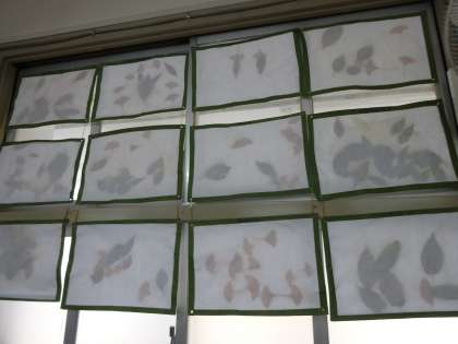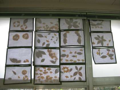 中・下段:2年生の作品。窓ガラスに掲示して、ステンドグラス風に光を通しています。