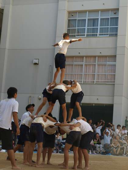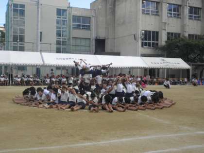 6年生は、5年生と一緒に苦しい練習に耐え、小学校最後の演技「組体操」に挑戦しました。運動場には、音楽と合図の笛の音だけが響き、観客は息を飲んで次々と変わる隊形やキビキビとした動きを見つめていました。