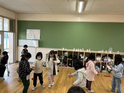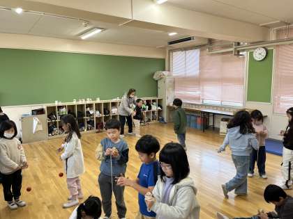生活科で正月遊びでけん玉やコマ回しをしました。コマを回すのが難しい様子でした。