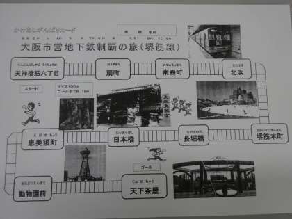 天神橋筋六丁目(天六)駅をスタートして、坂筋本町駅を通って、天下茶屋駅がゴールです。1マスが100Mで、スタートからゴールまで、8.1kmです。昨年より、距離がずいぶん短いので、完走する児童が何人出るか楽しみです。