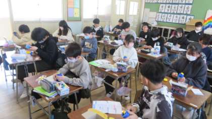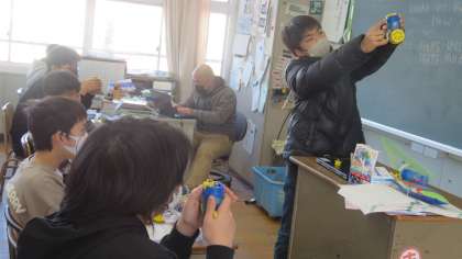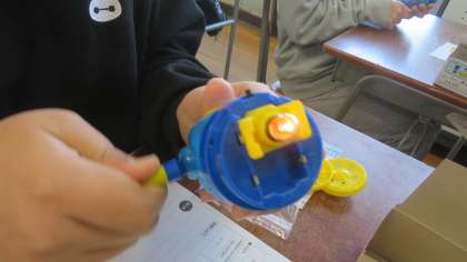 発電の仕組みについて学ぶために、手回し発電機を使って実験をしました。豆電球や発光ダイオードが光るか、みんなで確認しました。実験が得意な友だちが前で上手に説明をしていました。