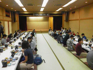 予定通り、元気に宿泊施設に到着です。荷物を置いたら避難訓練、そしてお楽しみの夕食です。テーブルに並んだ品数の多さにみんなびっくり。残さず食べましょう。