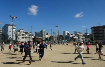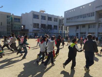 大寒の翌日の今日は、昼間はお日様が照って、外はわりとあったかかったです。かけ足タイムにみんな元気よく走っていました。かけ足カードも「中央線」を終わって、「四つ橋線」に入っている児童がいます。