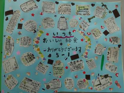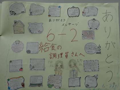 今日は、給食委員から給食調理員さんに各学級からの寄せ書きをプレゼントしました。