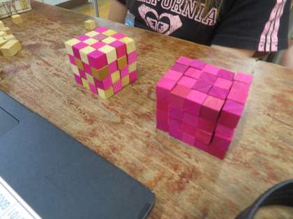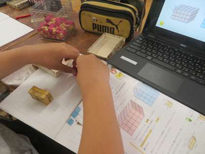 直方体や立方体のかさについて、ブロックを使って考えていきました。みんなブロックを積むことに悪戦苦闘していましたが、できた時にはとてもうれしそうな表情をしていました。