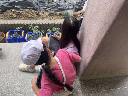 生活科のミニトマトをかんさつし、タブレットノートに書いています!少しずつ成長しているミニトマトを見て、みんな嬉しそうです♪