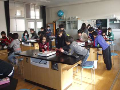 実験1では、手回し発電機で電気を作り、電気が通ることで、熱くなったり、扇風機が回ったり、光がついたりするのを体験しました。
