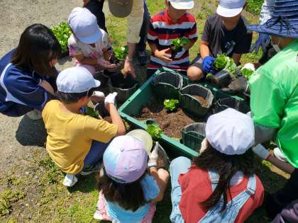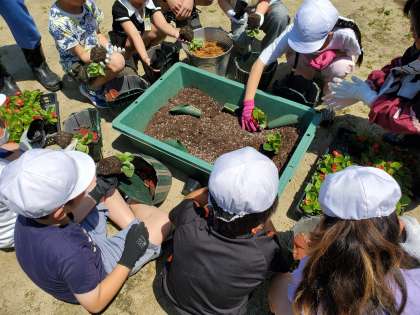 植栽活動で、ベゴニアの花を植えました。八幡屋公園事務所の方や、ボランティアスタッフの方が来てくださり、花の植え方を教えてくださいました。港中学校の職場体験に来ていたお兄さんやお姉さんにも手伝ってもらいました。