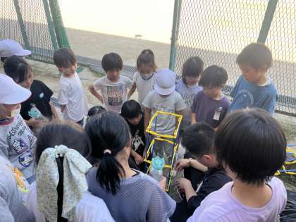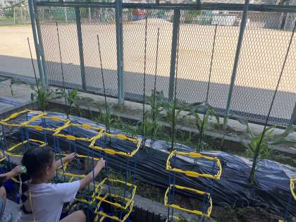 支柱の立てかたを学習し、それぞれのミニトマトに支柱を立てていきます。