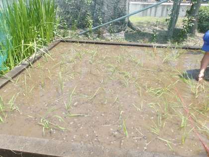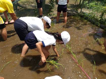 学習園にある水田に子どもたちの手で苗を植えました。なかなか上手に植えることができず、苦戦していましたが、協力して最後まで取り組むことができました。