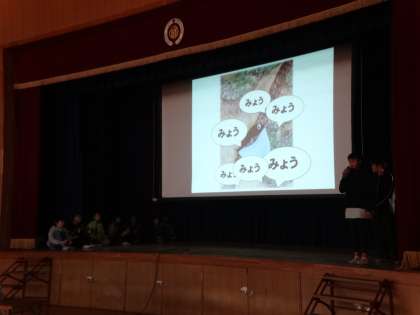 児童集会で図書委員会が「あたごの浦」の朗読をしました。楽器も取り入れた楽しい朗読でした。