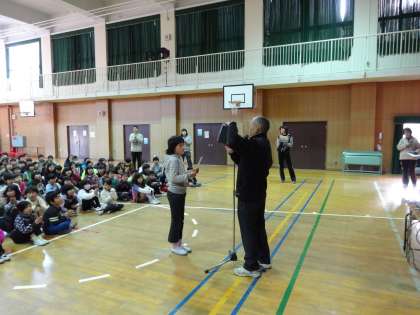 朝の児童集会で漢字検定で優秀な成績をあげた児童が表彰されました。また、全員に合格証書等の賞状が渡されました。