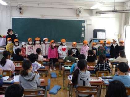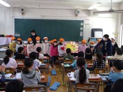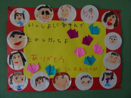 昨日の1年生との交流会のお礼に、八幡屋保育所ひまわり組の子どもたちが、1年生児童にプレゼントを持ってきてくれました。かわいい似顔絵も入っていて、1年生の教室に飾らせてもらいました。