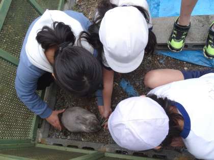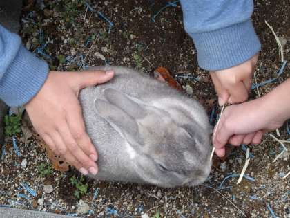 運動場の端のうさぎ小屋にいつもは住んでいるニンニンが、今日は給食室前の柵の中で子どもたちと遊びました。児童は休み時間ごとに、飼育栽培委員会の児童の世話で頭をなでたり、えさの干し草を食べさせたりして、ふれあいました。