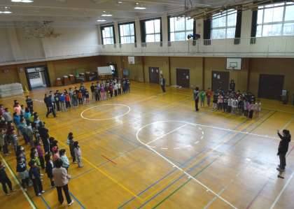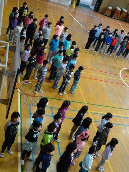 3月3日(木)の「卒業を祝う会」に向けて、1〜5年が隊形と歌の練習をしました。学級休業で2クラス少なく、少しさびしかったです。