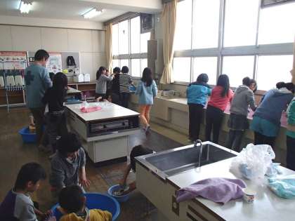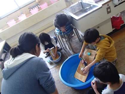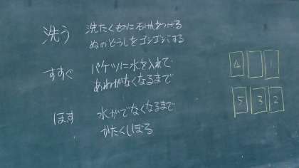 洗たく板と洗たくせっけんを使って、ハンカチや靴下をごしごし手洗いし、ゆすいで干しました。