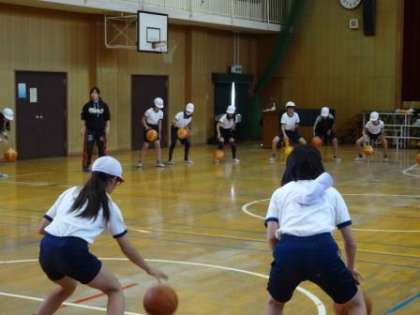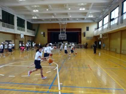 大阪市中央体育館で大阪エヴェッサ ジュニアバスケット教室のコーチの方が、ドリブルやシュートの基本を教えてくださいました。