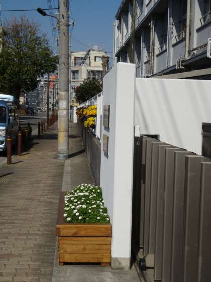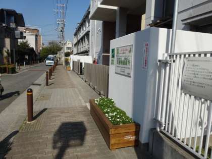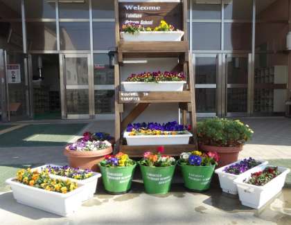 管理作業員さんが古いバケツにペンキを塗って、花を植えて正門前に置くと、正門前がさらにきれいになりました。今日の暖かい日差しに照らされてすごく華やかになりました。小学校の前を通られるときに見ていただければと思います。地域との植栽によるビオラと一体となったきれいな風景になり、通りかかった近所の方にもほめていただきました。